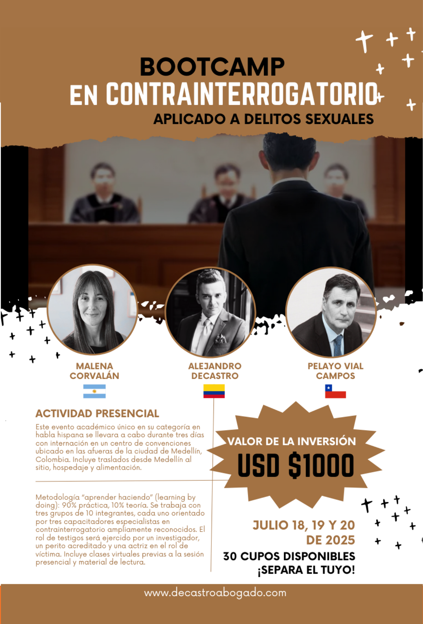El Bootcamp está dirigido por Alejandro Decastro, acompañado por dos docentes internacionales con amplia trayectoria en contrainterrogatorio y litigación oral.